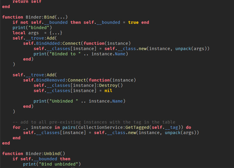 When the Tag of a class and the class itself gets passed through its constructor and then binded (Hence the name Binder) It will listen for any newly parts or objects with the same Tag given through its constructor and initialize the class with the newly added part or object